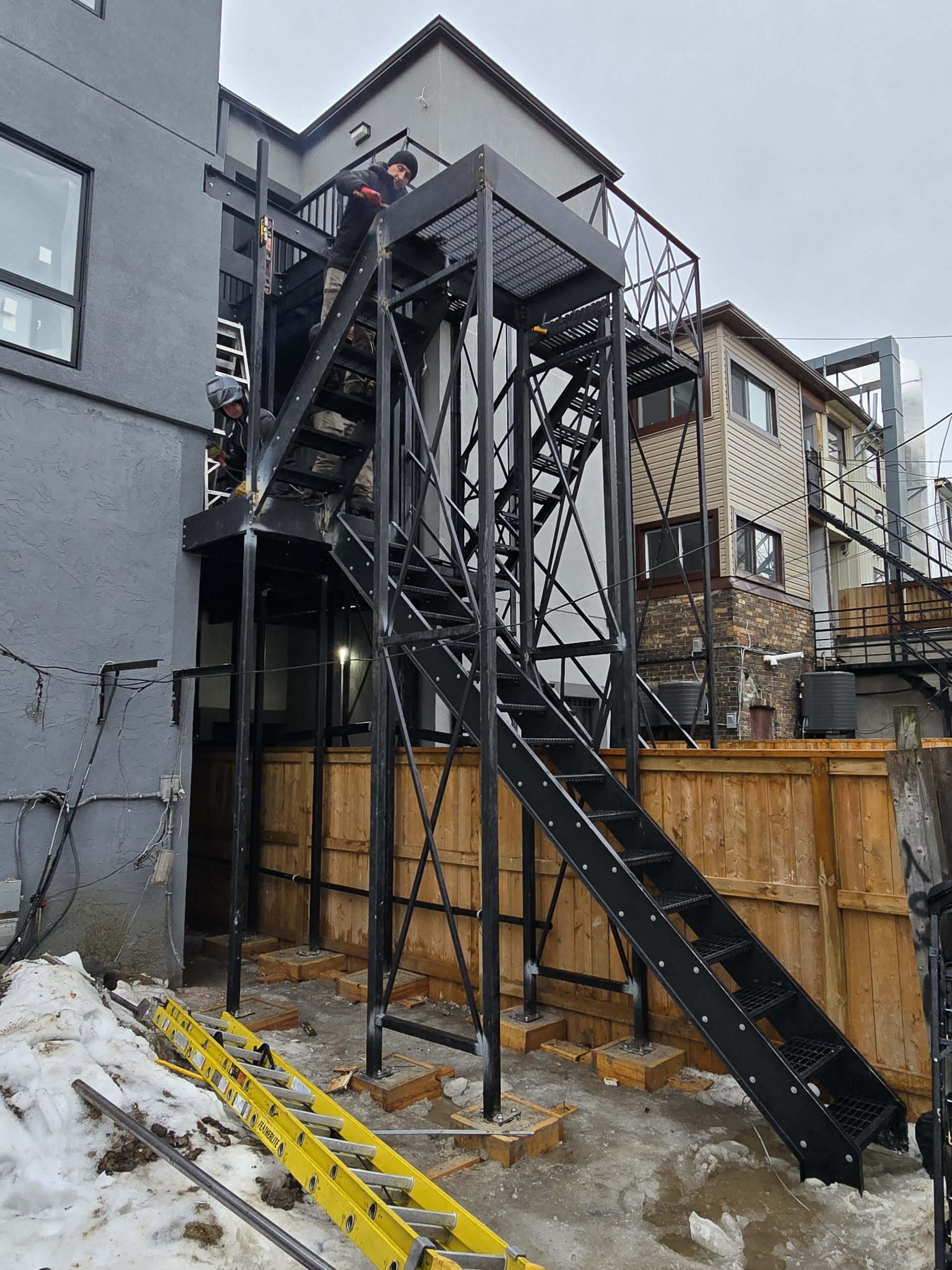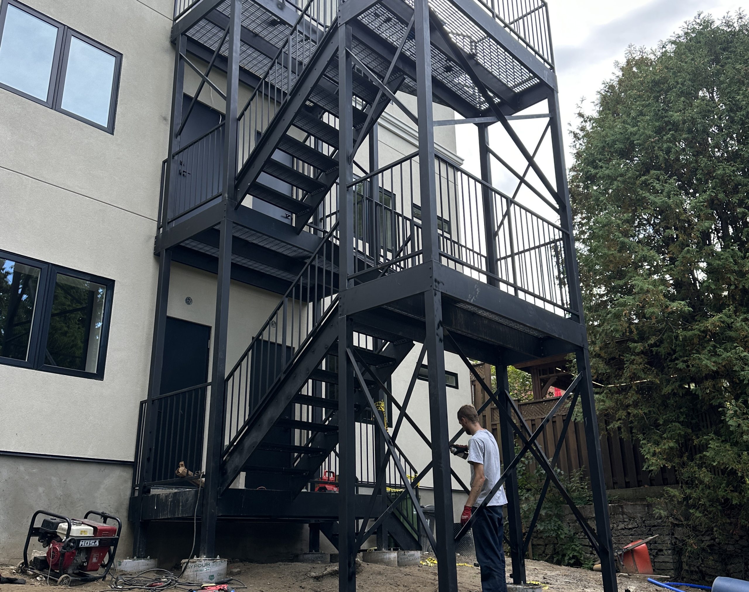Fire escape components — including platforms, stringers, treads, and guardrails — are built in our Etobicoke workshop using structural steel.